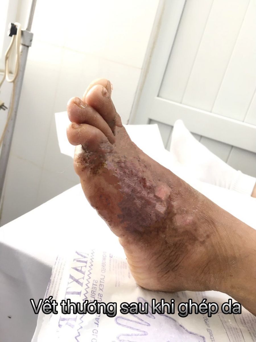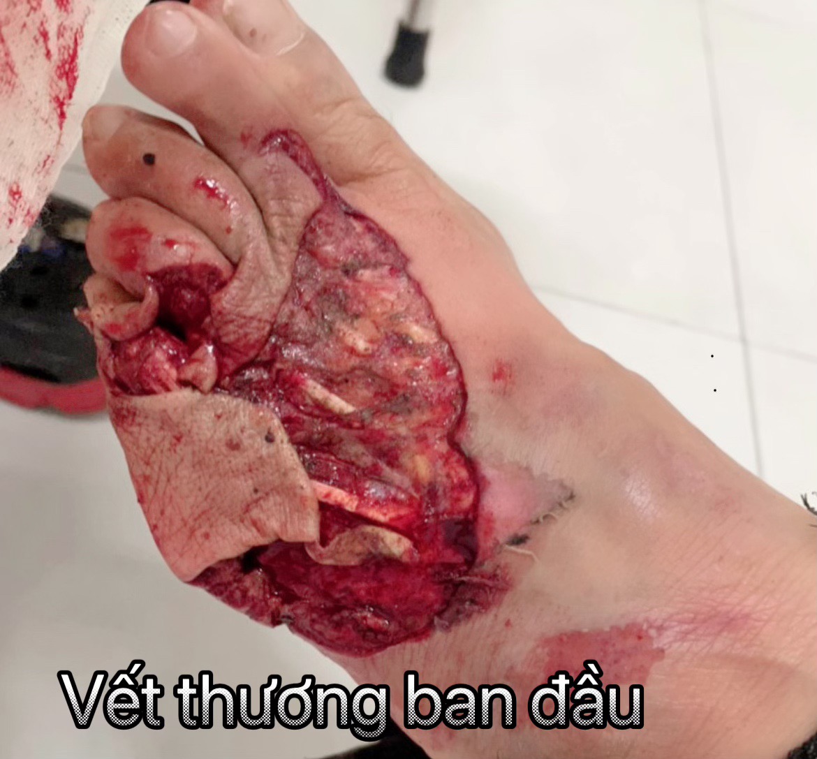 Bs Giang An_Trưởng Khoa Chấn thương chỉnh hình cho biết “Lúc vào viện do tình trạng Vết thương dập nát vỡ hở xương, mất ngón 5 và nền vết thương bẩn do vậy điều trị kéo dài và bệnh nhân đã trải qua 10 ngày đặt máy hút áp lực âm liên tục tại vết thương. Sau khi tháo máy hút liên tục bệnh nhân được vá da tự thân ngay, da tự thân lấy ở vùng bẹn (không ảnh hưởng đến thẩm mỹ). Sau 2 tuần vạt da sống tốt bệnh nhân được tập Phục hồi chức năng và dần lao động sinh hoạt bình thường”