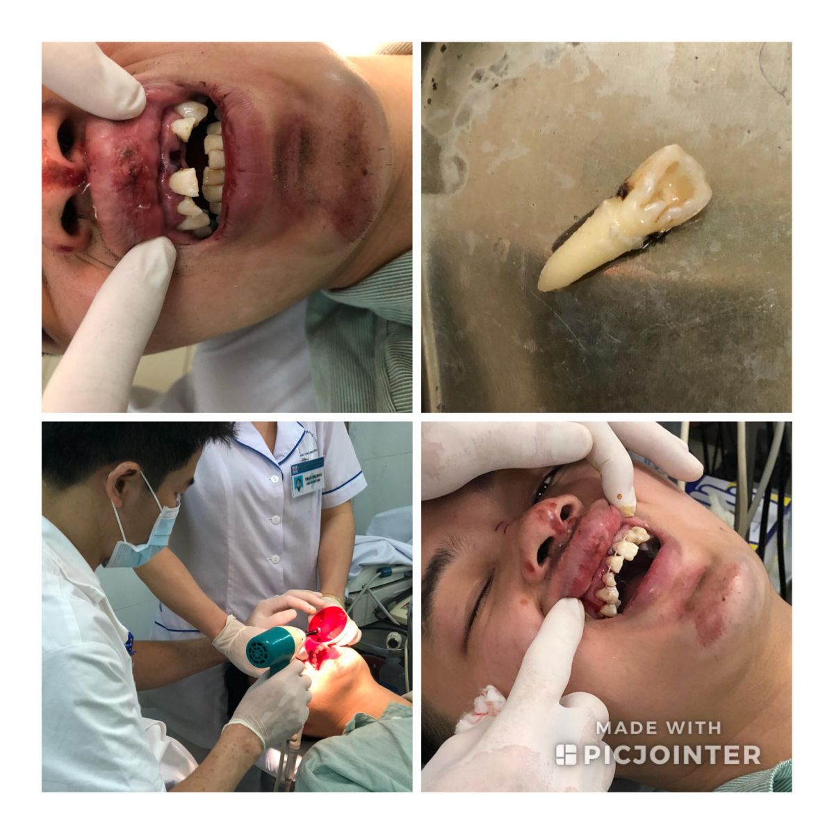 Bệnh nhân cho biết, trên đường đi làm do tránh người phía trước đã đâm vào giải phân cách giữa hai làn đường và được bạn đưa vào cấp cứu tại bệnh viện Nam Thăng Long. Sau khi thăm khám và thực hiện các chỉ định cận lâm sàng bác sĩ chuẩn đoán bệnh nhân bị chấn thương vùng hàm mặt, gãy thân răng R.11, R.12, R.22, Răng R.21 bật ra khỏi ổ răng.